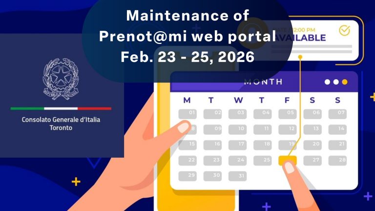 A Waiting List service will be activated in January. If all appointments are booked but there are some availabilities in the “Waiting List”, users will be given the option to sign up to the latter and the system will automatically assign the first available slot. Warning: if you refuse the appointment offered by the WL, you will exit the WL and must start again from the beginning. Please, remember that the WL has a limited number of places and a maximum time of permanence. Once the maximum time of permanence in the WL has elapsed without the system being able to assign an appointment, the user will automatically exit the WL and must restart the booking process via the Prenot@mi web portal. - Electronic Identity Card: 2025 Calendar open from December 3, 2025, for bookings from January 2026. Exceptionally, on December 3, 2025, slots are available from before 6:00 PM local time. The calendar is scrolling daily. New appointments are published starting at 6:00 p.m. Toronto time. The service is intended exclusively for Italian citizens registered with AIRE in the consular district of the Consulate General of Italy in Toronto. A Waiting List Service will be activated in January. For information on how to use the Waiting List, please see the previous paragraph.